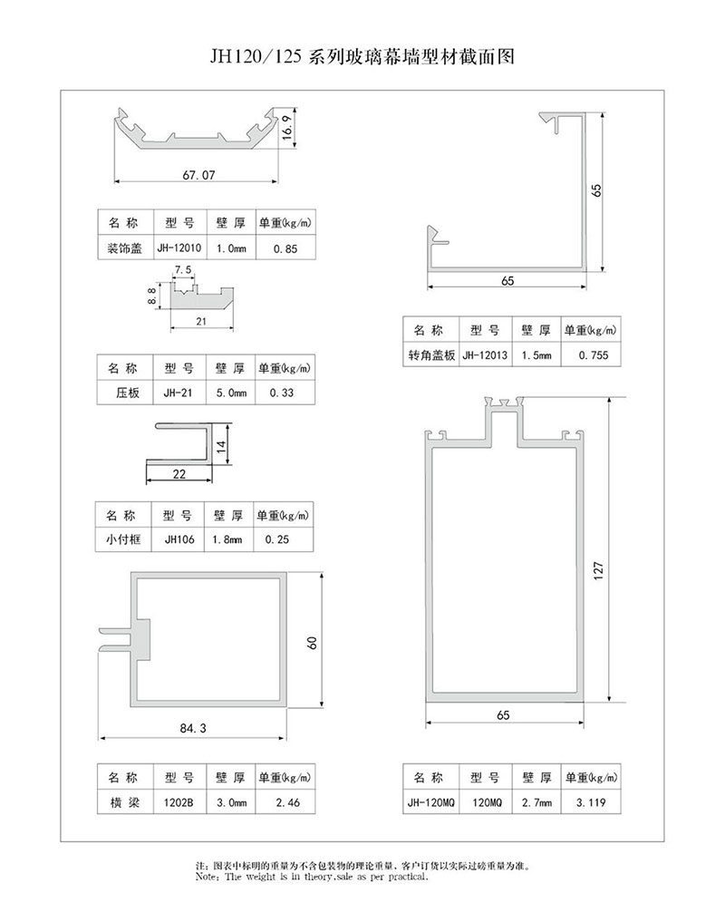 120/125系列玻璃幕墻型材截面圖