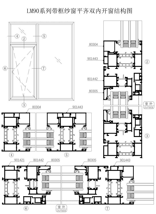 LM90系列帶框紗窗平齊雙內開窗結構圖