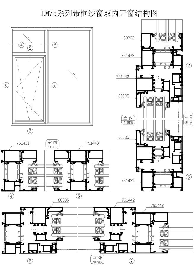 LM80系列帶框紗窗雙內(nèi)開窗結構圖