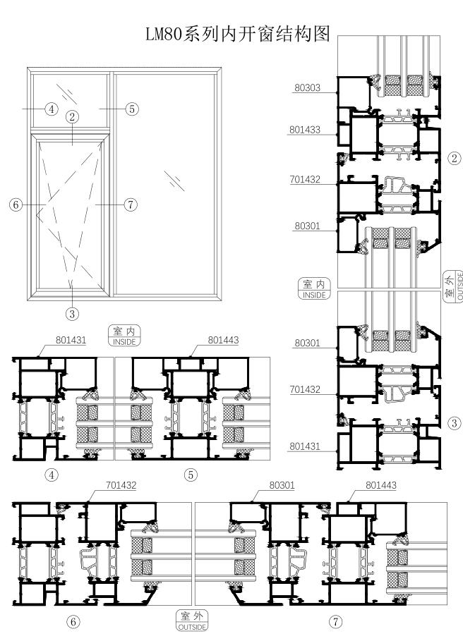 LM85系列帶框紗窗平齊雙內開窗結構圖